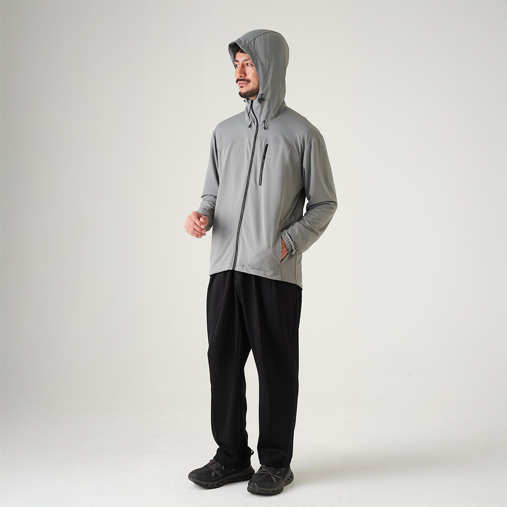肌に触れた瞬間に冷たさを感じる接触冷感素材を採用した、軽量フード付きジップジャケット